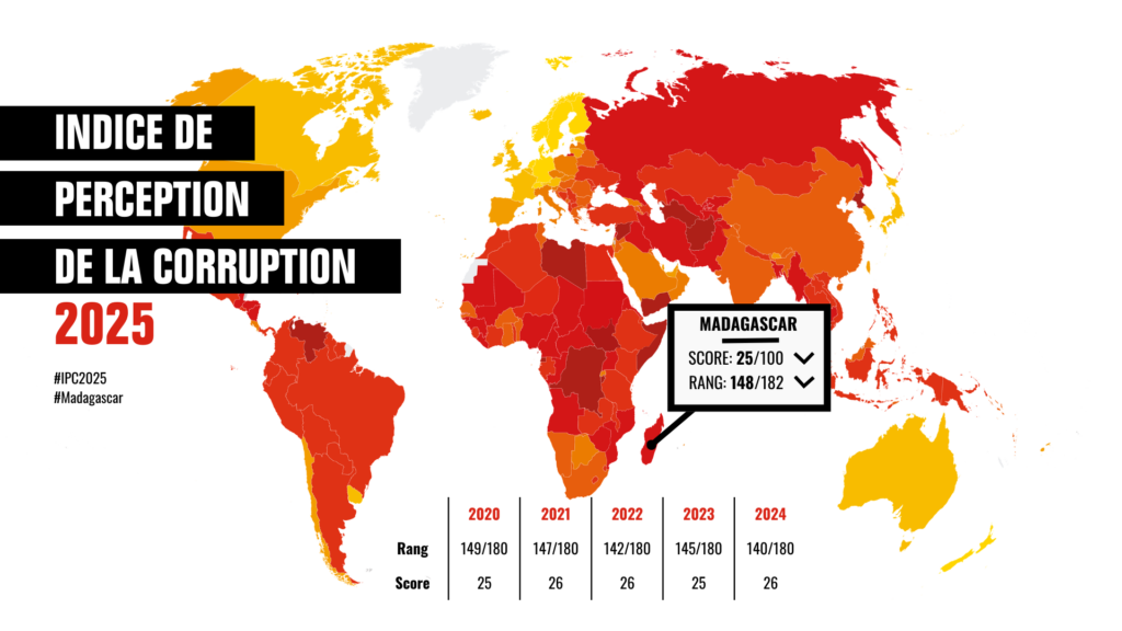 Antananarivo, 10 février 2026 — Transparency International – Initiative Madagascar (TI-MG) a présenté aujourd’hui les résultats de l’Indice de Perception de la Corruption (IPC) 2025, l’indicateur mondial de référence qui mesure la perception de la corruption dans le secteur public.
